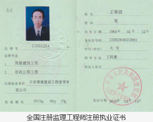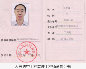 王春波:1964年2月生,1986年10月畢業(yè)于哈爾濱建筑工程學(xué)院工業(yè)與民用建筑專業(yè),本科學(xué)歷,高級(jí)工程師,全國(guó)注冊(cè)監(jiān)理工程師,人民防空工程監(jiān)理工程師,全國(guó)環(huán)境監(jiān)理工程師。主管項(xiàng)目部管理部。